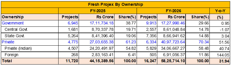The ownership pattern in FY2026 showed a clear shift in favour of the private sector. Private sector investment rose by 51.56 percent to Rs 40,97,723.64 crore, raising its share in total fresh investment to 70.34 percent from 61.23 percent in FY2025. In contrast, government investment was almost unchanged in value terms at Rs 17,27,990.46 crore as against Rs 17,11,734.18 crore a year earlier, but its share declined sharply to 29.66 percent from 38.77 percent.