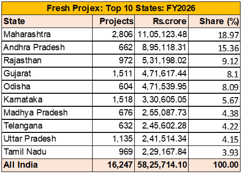 Fresh investment announcements in India registered a strong increase in FY2026 over FY2025, both in terms of project count and investment value. Total project investment increased by 31.94 percent to Rs 58,25,714.10 crore from Rs 44,15,389.56 crore, while the number of projects rose by 38.63 percent to 16,247 from 11,720.