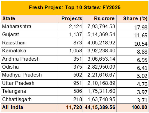 The overall state-wise pattern indicated that fresh investment remained concentrated in a relatively small group of leading states, but there was notable movement within that group. Maharashtra consolidated its leadership, Andhra Pradesh emerged as the most improved state in the ranking, and Tamil Nadu re-entered the top tier.